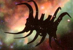 This ship is used to scout an area before the main fleet of Shadow ships come out of hyperspace. Just like any type of Shadow ship this has organic with the black shinny skin that is the trademark for any type of Shadow ship and also just like a Shadow ship, this ship can phase in and out of hyperspace. As seen in this picture the ship has spines on it that is just like the Battle Crabs-class ships, they aren't that long as theose is, but still tells that it is a ship that belongs to the Shadows. I don't know the length of this ship, but I know that it bigger than a Spitfire-class fighter, but is drawf by the Battle Crab-class ship. In being a small to medium to class ship this ship has a singal pliot at the helm of the ship, but I don't know for sure it is a living being flying or is just flow by remote like the fighters are.